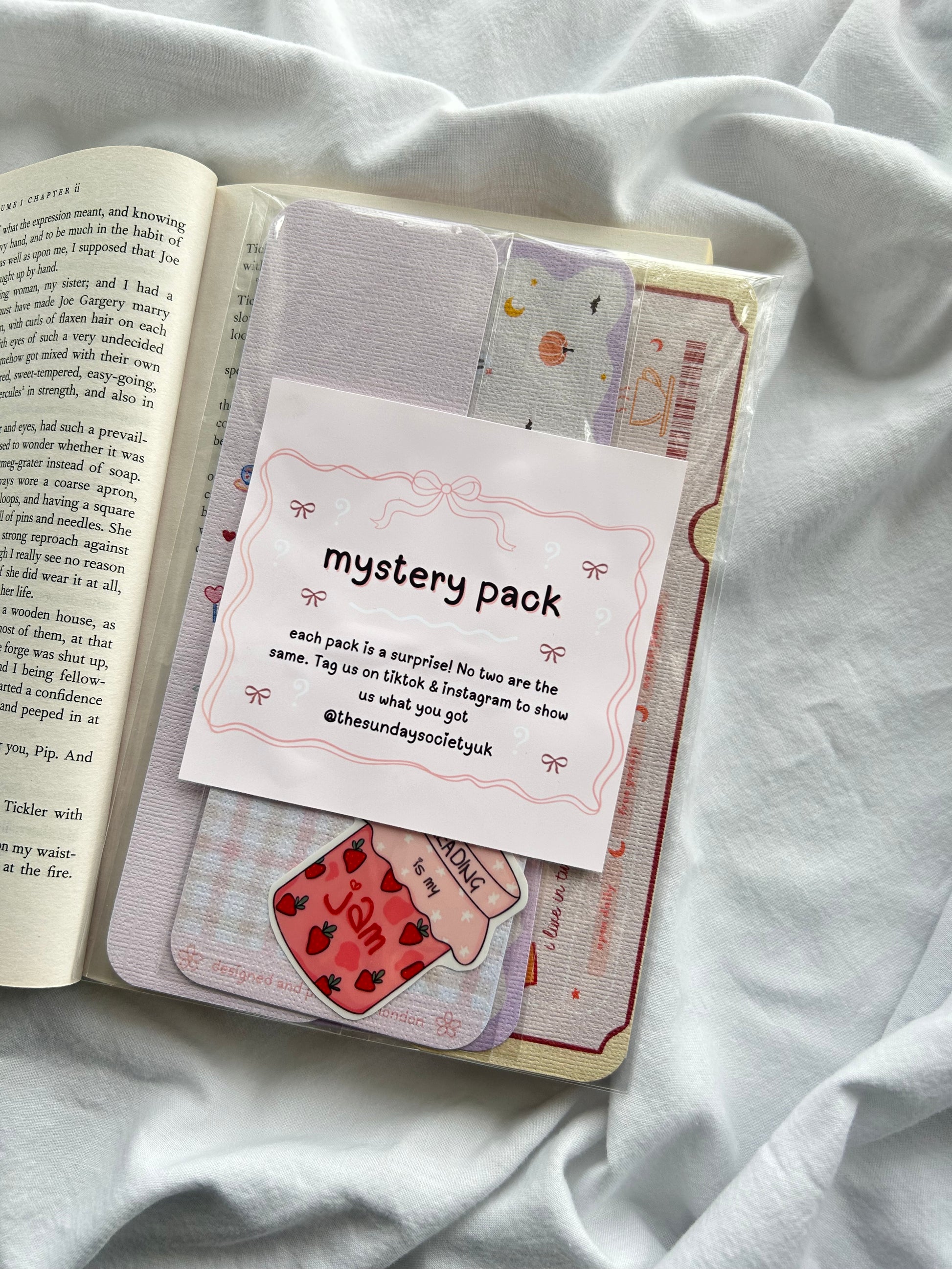 Each pack is different; packed with x3 different bookmarks and x1 sticker!